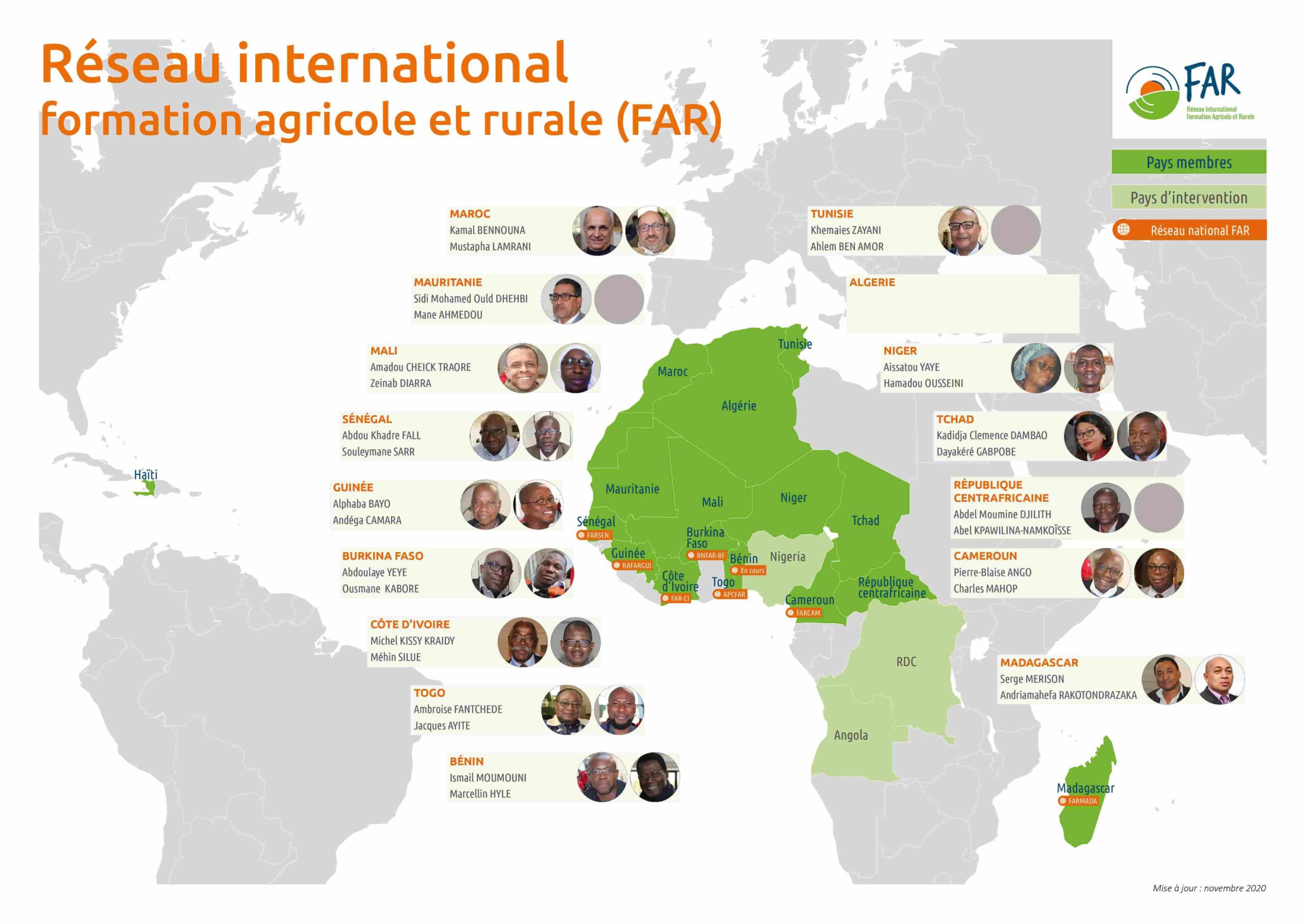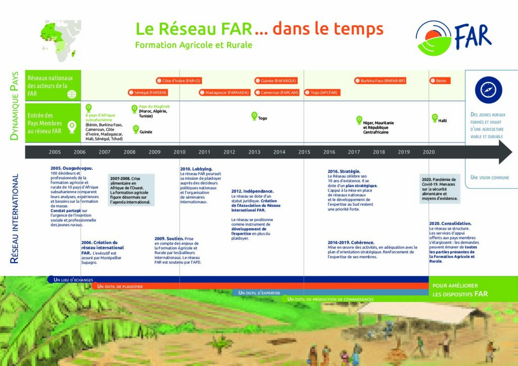 Le Réseau international Formation Agricole et Rurale (FAR) est né de la volonté de professionnels réunis à Ouagadougou en 2005 au cours de la conférence sur la « formation de masse en milieu rural, élément de réflexion pour la définition d’une politique nationale ». Le but du Réseau est de créer de l’emploi rural et de promouvoir une agriculture rémunératrice et durable.