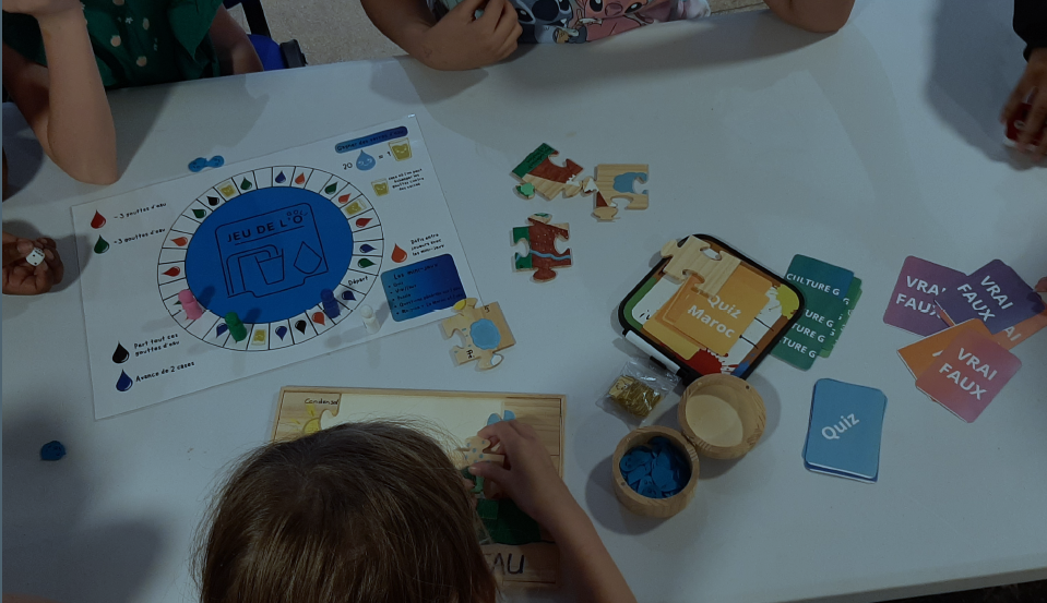 En 2025, l’action « Regards croisés sur les usages agricoles de l’eau » a été menée en quatre étapes. La première a consisté en une sensibilisation aux enjeux avec un film (« La Théorie du Boxeur »), des jeux coopératifs et une fresque du climat. La deuxième a approfondi les connaissances par des visites de stations d’épuration, la diversification horticole et des visioconférences avec Khénifra. La troisième a porté sur la construction des jeux, de la mécanique à la conception graphique et aux tests. Enfin, la quatrième a consisté en l’animation et l’utilisation de ces outils lors de présentations publiques.