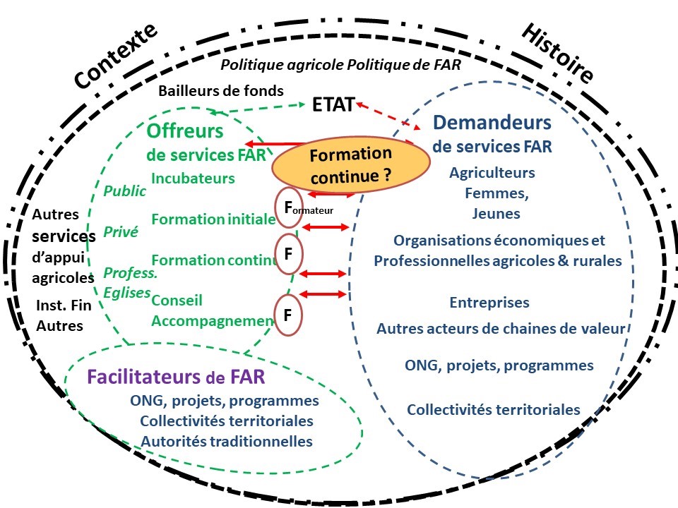A partir de la synthèse documentaire et des rencontres institutionnelles, nous avons analysé le contexte et des acteurs du système de la formation continue dans la zone de Kpalimé. Ce qui nous a permis de classer les acteurs en trois catégories : les demandeurs de services de formation (agriculteurs, éleveurs, transformateurs, organisations de producteurs, jeunes, femmes, entreprises, …), les offreurs de services de formation (69 CFAR, ICAT, Inades-Formation, …) et les facilitateurs de la formation ou services d’appui à la formation (collectivités territoriales, autorités locales, institutions financières, …).